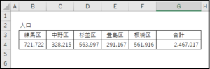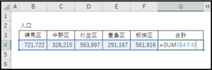 セルG4に以下のような数式を入力します。(=SUM(B4:F4))